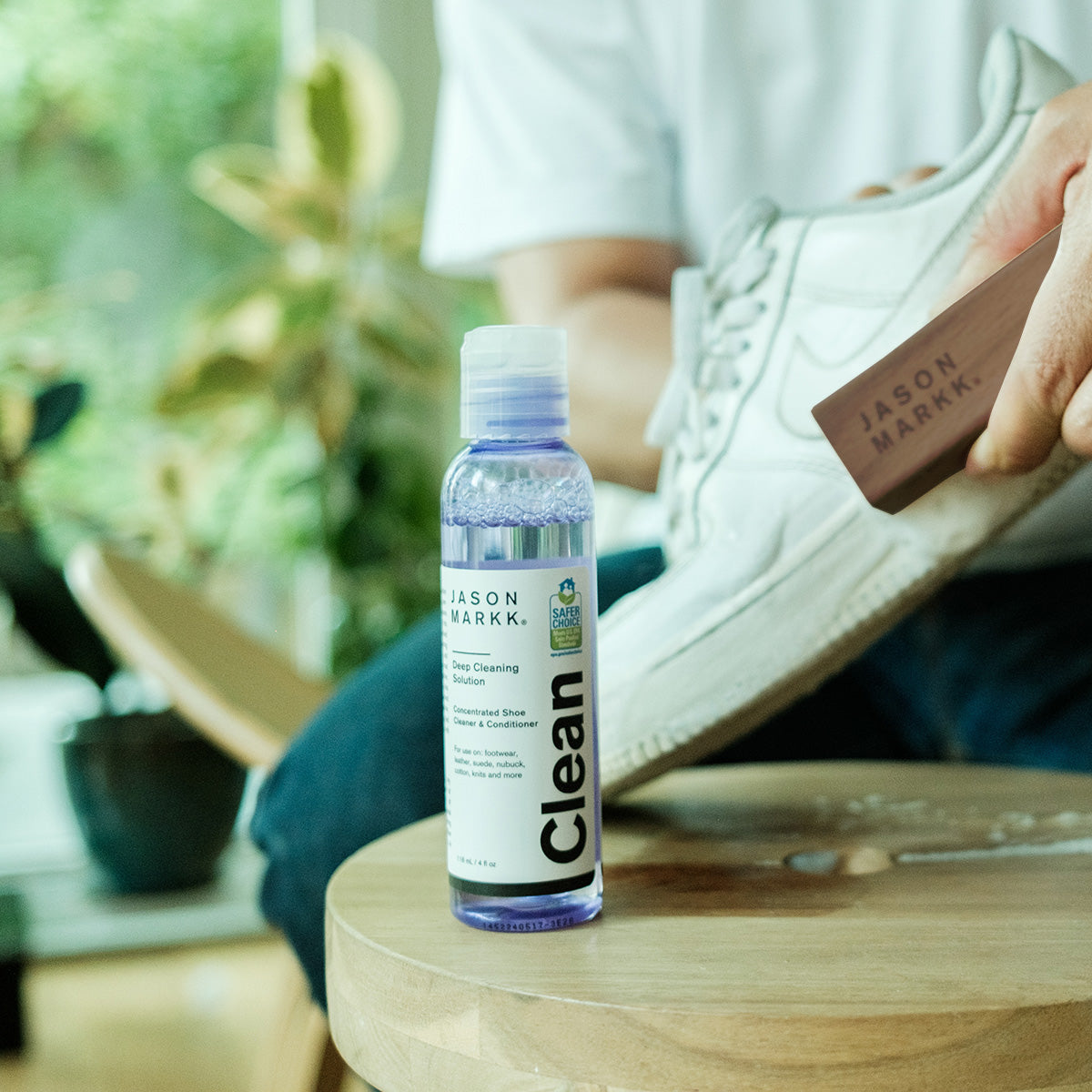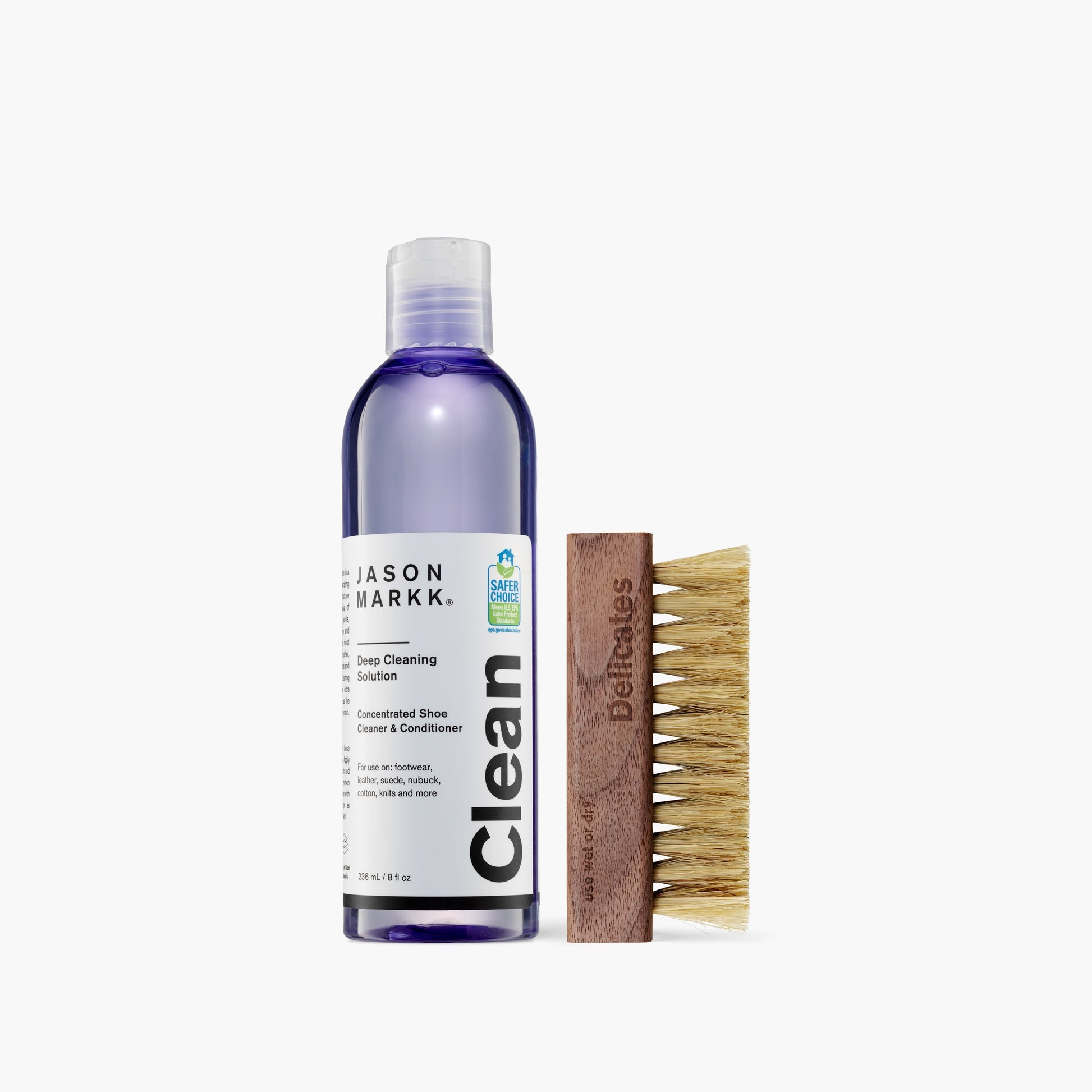 This bundle pairs our 8 oz. Premium Deep Cleaning Solution, a high quality, concentrated, penetrating solution that lifts and cleans soils that are deeply embedded into the material of your footwear and other wearables with our Delicates Cleaning Brush, designed to gently clean without damaging delicate surfaces.