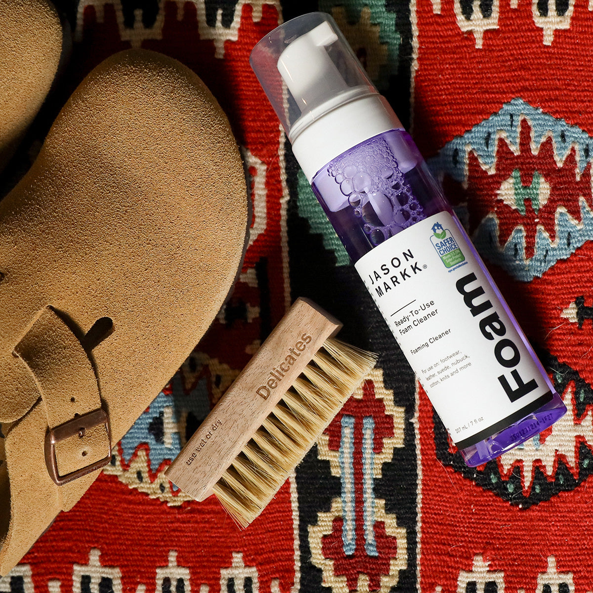 The Suede Care Bundle is designed to clean and protect suede and nubuck without compromising texture. Our Premium Deep Cleaning Solution effectively lifts dirt and stains, while the Delicates Cleaning Brush safely scrubs without damaging delicate materials. Finish with Repel, a breathable barrier that helps guard against water and stains. Keep your suede looking fresh and feeling soft with this bundle.