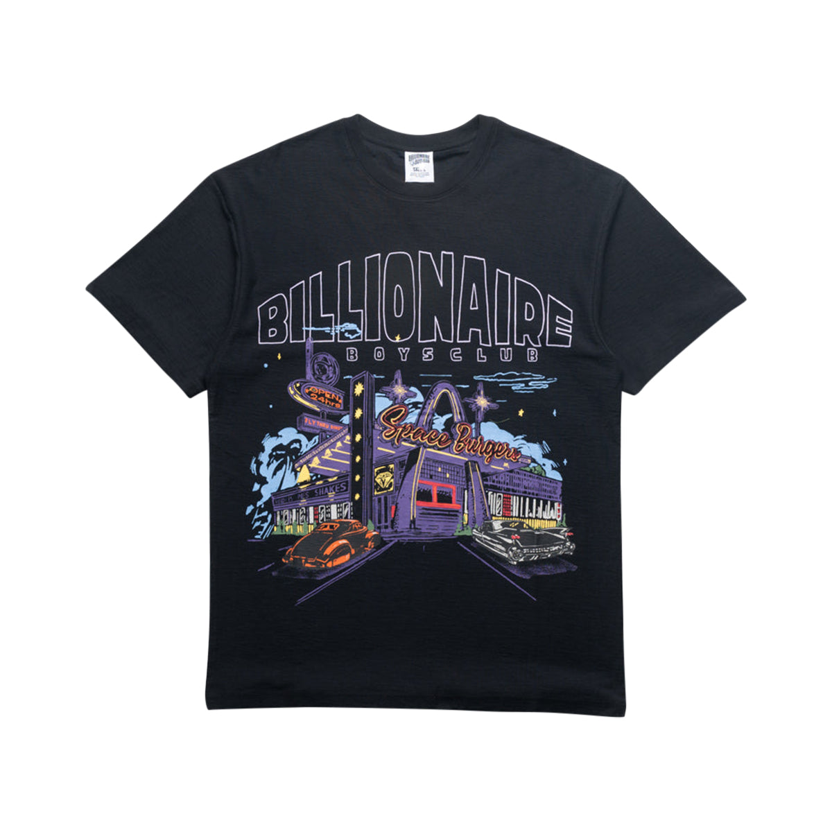 The Billionaire Boys Club BB Diner Short Sleeve Knit Tee adds a fun, late-night diner feel to your outfit with its bright "Space Burgers" graphic. This men's knit tee combines streetwear cool with premium quality, showcasing a colorful BBC "Diner" print on the front and the classic BBC astronaut logo on the upper back. Celebrate the brand’s unique blend of fashion, music, and culture, and let your style stand out wherever you wear it.