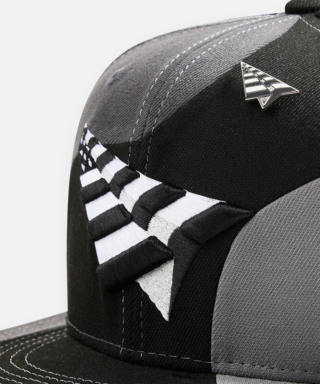 A signature plane is embroidered across this flat brim hat featuring a swirling colorblock pattern and an enamel pin. Color: black
