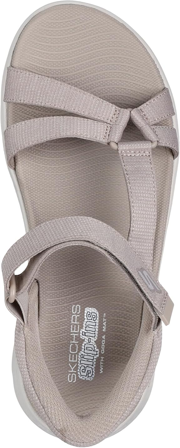 Experience an effortless way to wear your favorite sporty sandal with Skechers Hands Free Slip-ins: GO WALK Flex Sandal - Illuminate. Designed with our Heel Pillow, this strappy athletic sandal features a mesh upper with an adjustable instep strap, a contoured Goga Mat footbed, lightweight ULTRA GO cushioning, and a back heel piece. Machine washable.