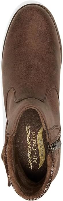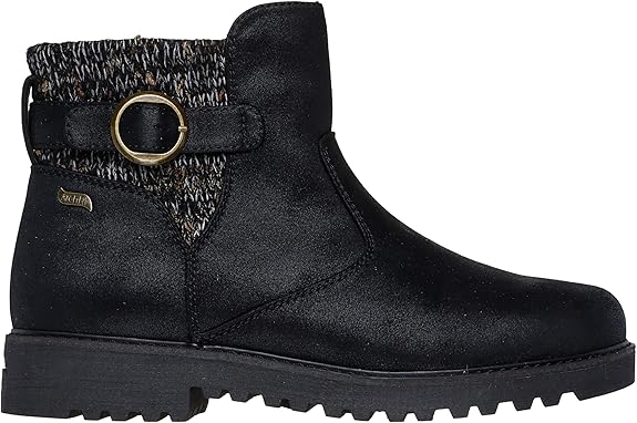 Step into winter style with these fashionable womens shoes from Skechers. The Arch Fit Marlie Weekend Chat boots combine modern comfort with casual elegance. These vegan ankle boots feature a microleather upper with knit shaft detail, complemented by a stylish wrap buckle and convenient side zip closure. The podiatrist-certified arch support and removable insole provide exceptional comfort for all-day wear. Perfect for the fashion-conscious woman seeking both style and comfort in their winter footwear.