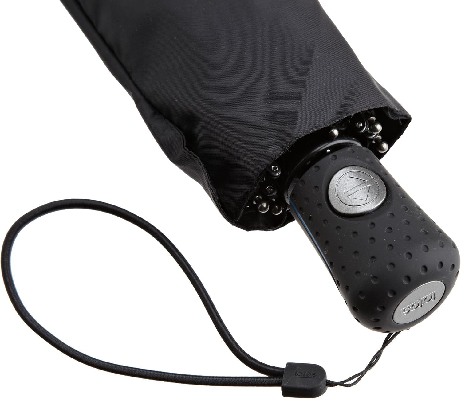 Don’t let a rainy day slow you down! Stay dry with the totes auto open compact foldable travel umbrella. Designed for portability with a convenient easy-carry wrist strap and wide tie strap for easy, compact storage. Totescoat application repels water for superior rain protection. Auto opens and closes with the touch of a button keeping one hand free when you're on the go. Conveniently folds for easy storage. The premium ergonomic handle with rubber coating ensures a comfortable, secure grip even in rainy conditions.