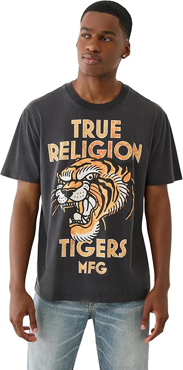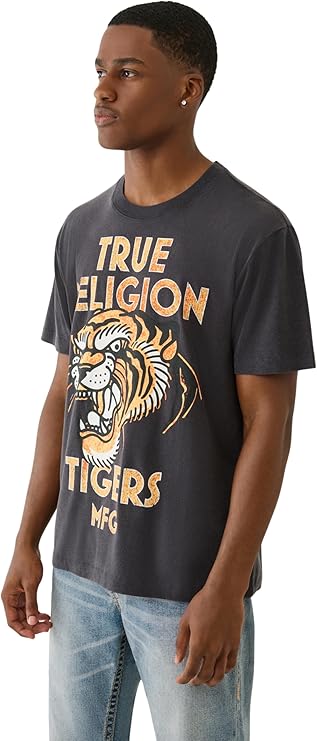 True Religion Men's MFG Tiger Vintage Tee. Crafted from soft, this short sleeve crewneck t-shirt features a striking tiger graphic that gives off vintage, streetwear-inspired vibes. Designed with comfort and attitude in mind, it’s a standout staple for any casual wardrobe.