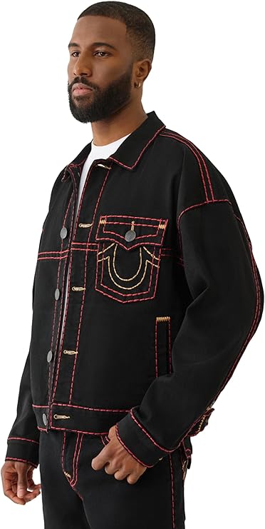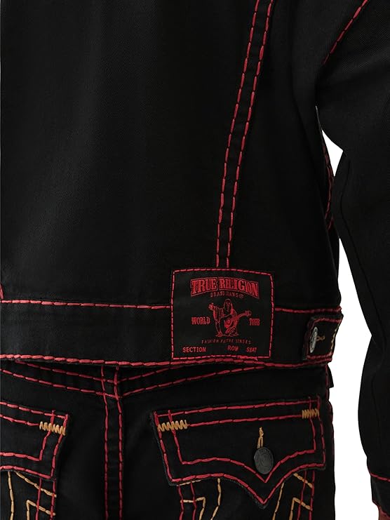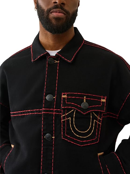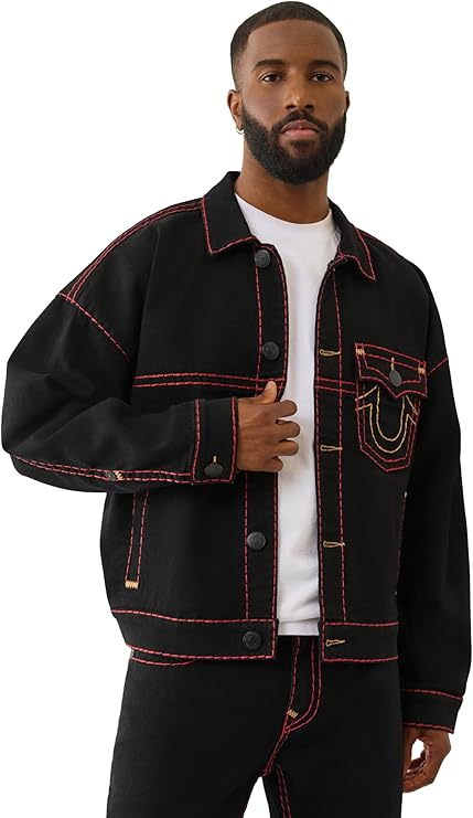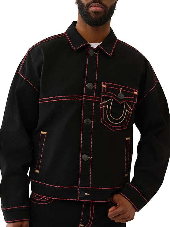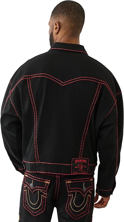 True Religion Men's Super T Cropped Denim Jacket. This stylish take on a classic trucker features signature Super T contrast stitching, a cropped silhouette, and distressed detailing for that perfectly worn-in look. Made from premium stretch denim for comfort and mobility, this jacket is finished with button-flap chest pockets, a button front, and iconic True Religion hardware. It’s a versatile layer that instantly elevates any casual outfit.