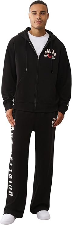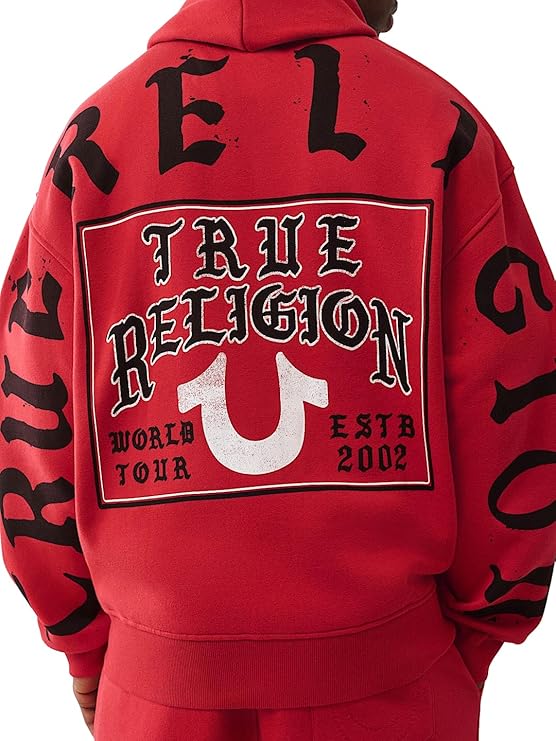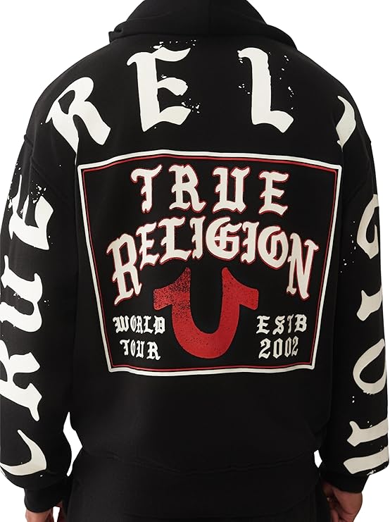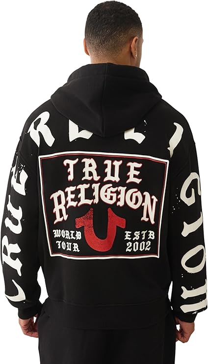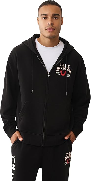 True Religion Men's TR Flag Relaxed Zip Up Hoodie. This hoodie features a relaxed fit and a bold TR flag graphic on the chest, combining classic streetwear style with everyday comfort. Made from a soft cotton blend, it includes a full front zipper, adjustable drawstring hood, and ribbed cuffs and hem. Perfect for layering or casual wear, this zip-up hoodie is a must-have for your casual wardrobe.
