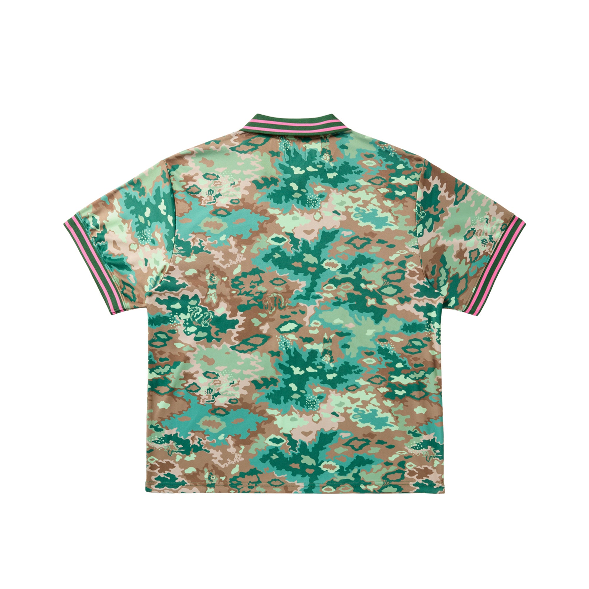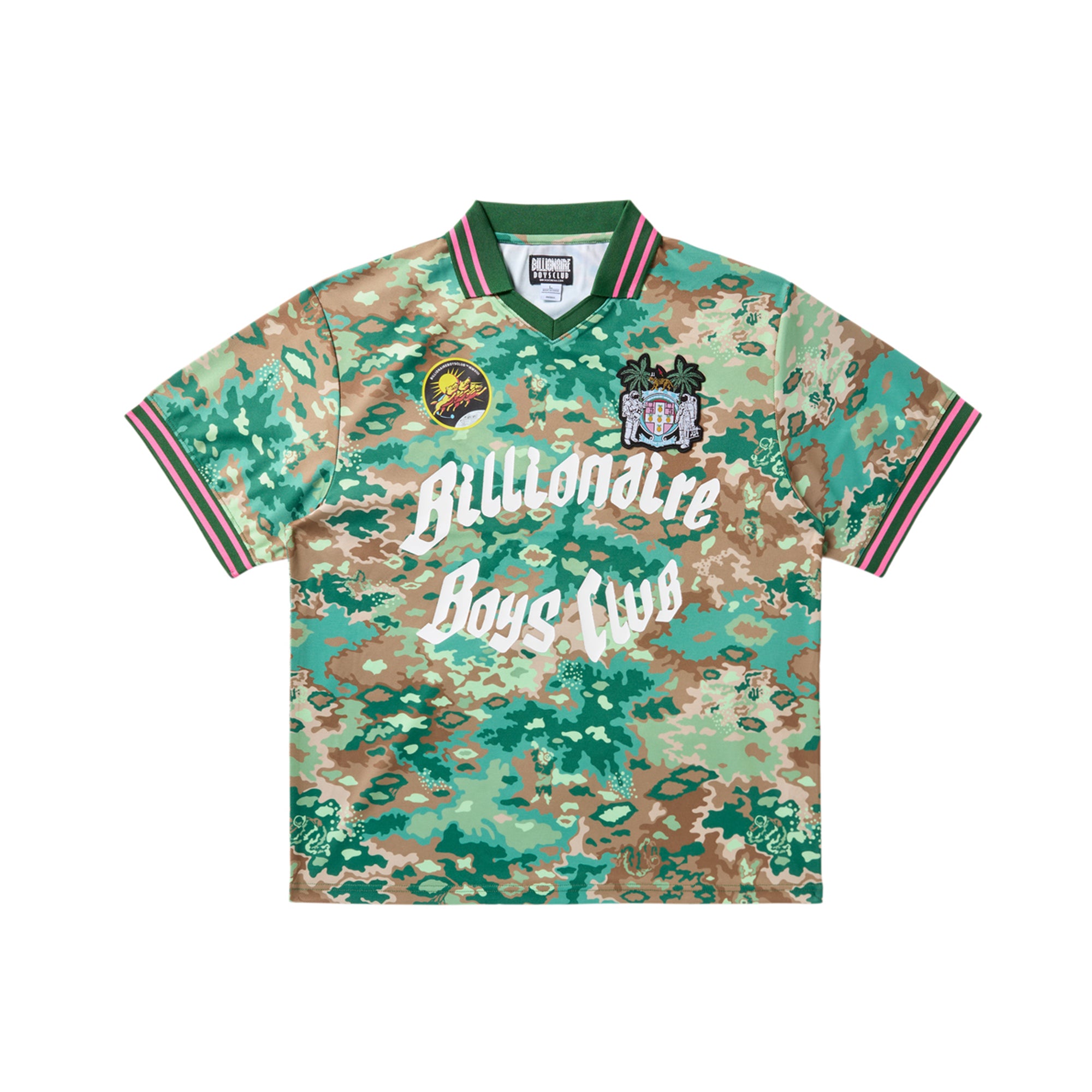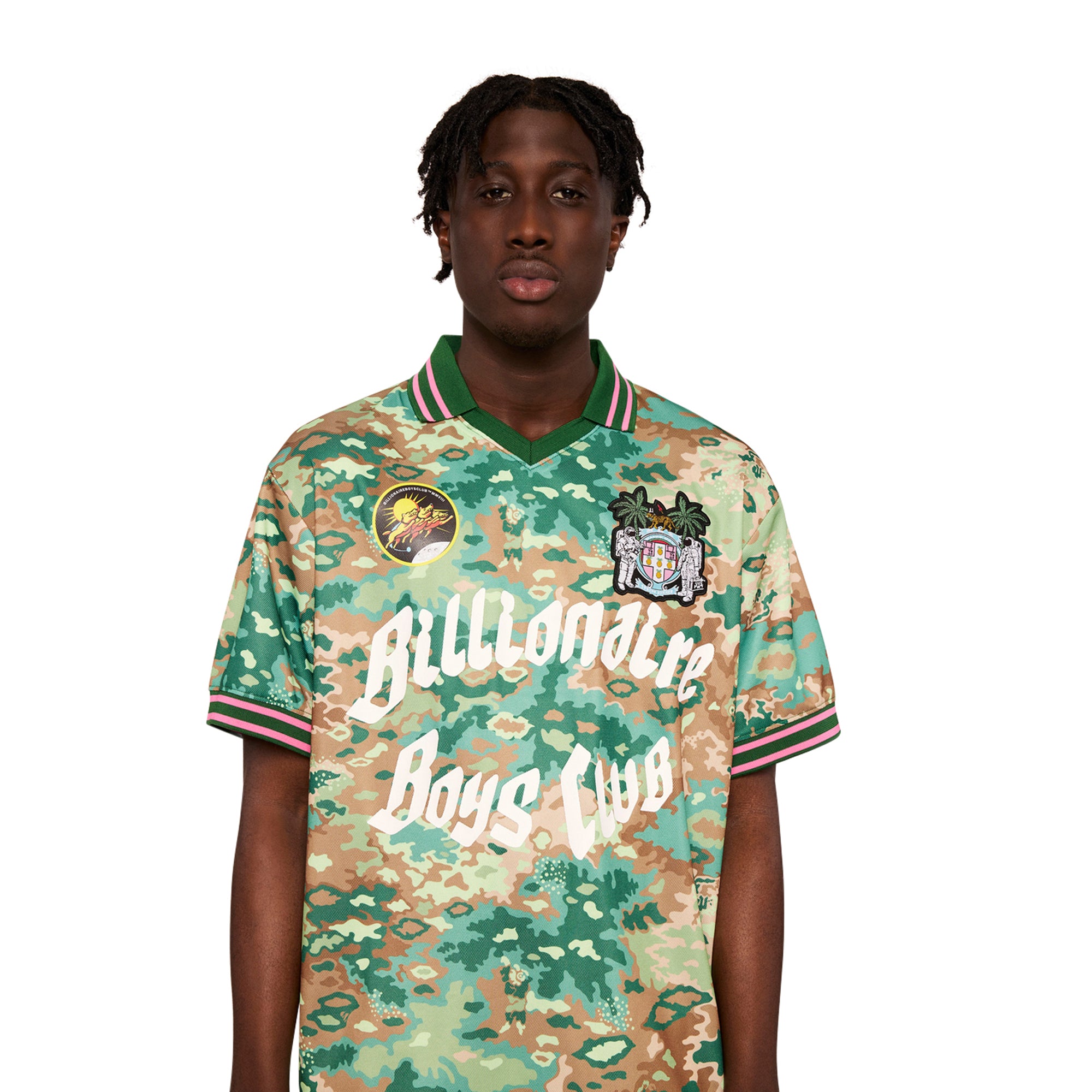 The Galaxy Knit Jersey from Billionaire Boys Club is 100% Polyester, made with all-over sublimated camouflage. The eden green jersey features soccer-inspired elements like a crest patch and print on the chest, along with a printed wordmark on the front.