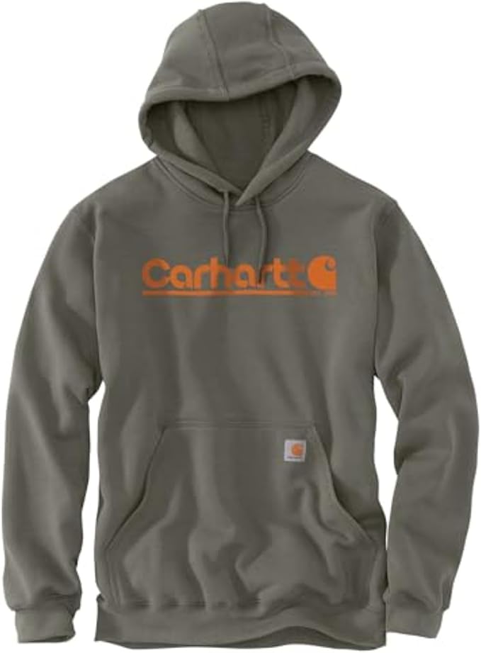 This men's hooded sweatshirt gives you a comfortable, midweight layer to pull on through the cold. Built from cotton-blend fabric, with a loose fit that's roomy through the chest and shoulders. Featuring a kangaroo pocket and Carhartt graphic in front.