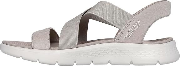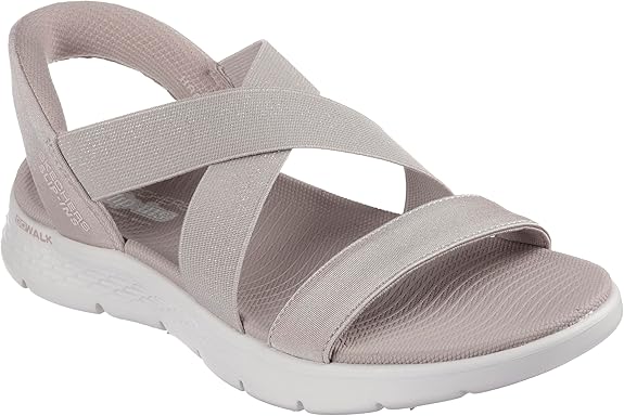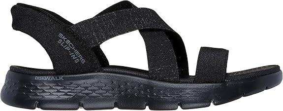 Add effortless style with Skechers Hands Free Slip-ins: GO WALK Flex Sandal - Glimmer Up. Designed with our Heel Pillow, this strappy athletic sandal features a textile upper with elastic instep straps for a customizable fit, a contoured Goga Mat footbed, lightweight ULTRA GO cushioning, and a back heel piece. Machine washable.