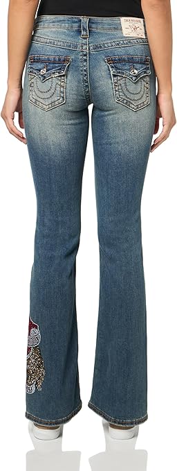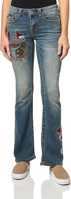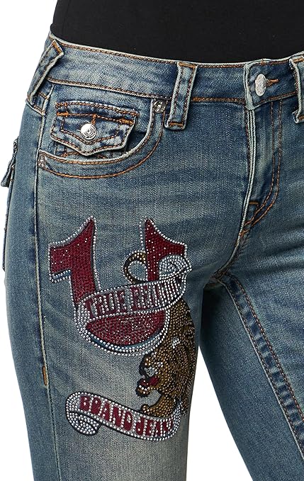 True Religion Women's Tattoo Crystal Becca Mid Rise Boot Big T Jeans. These stylish bootcut jeans feature a flattering mid-rise fit that sits comfortably just below the waist, enhancing your natural shape while providing all-day comfort. The bootcut silhouette creates a timeless and versatile look, perfect for pairing with everything from heels to boots.